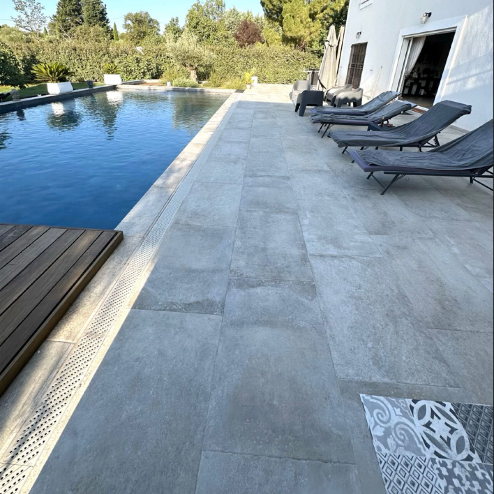 de 120 m² en béton désactivé avec une finition en gravier roulé.