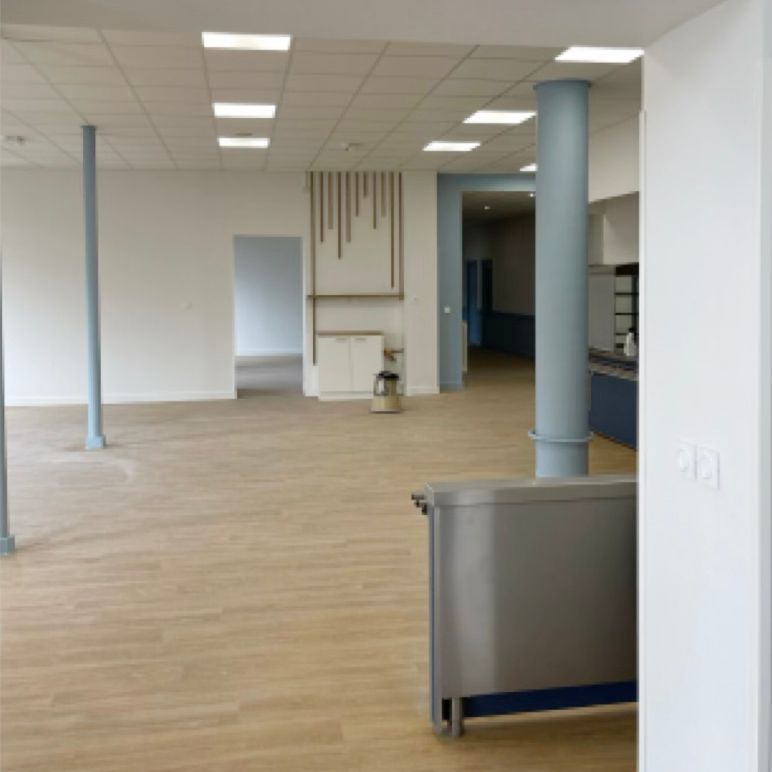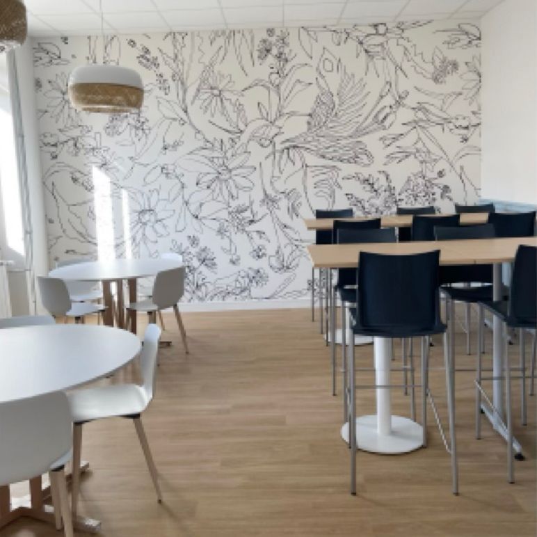 Rénovation du réfectoire pour le personnel de l’hôpital de Pierrefeu : faux plafond, peinture, papier peint, sols souples, habillage mural.